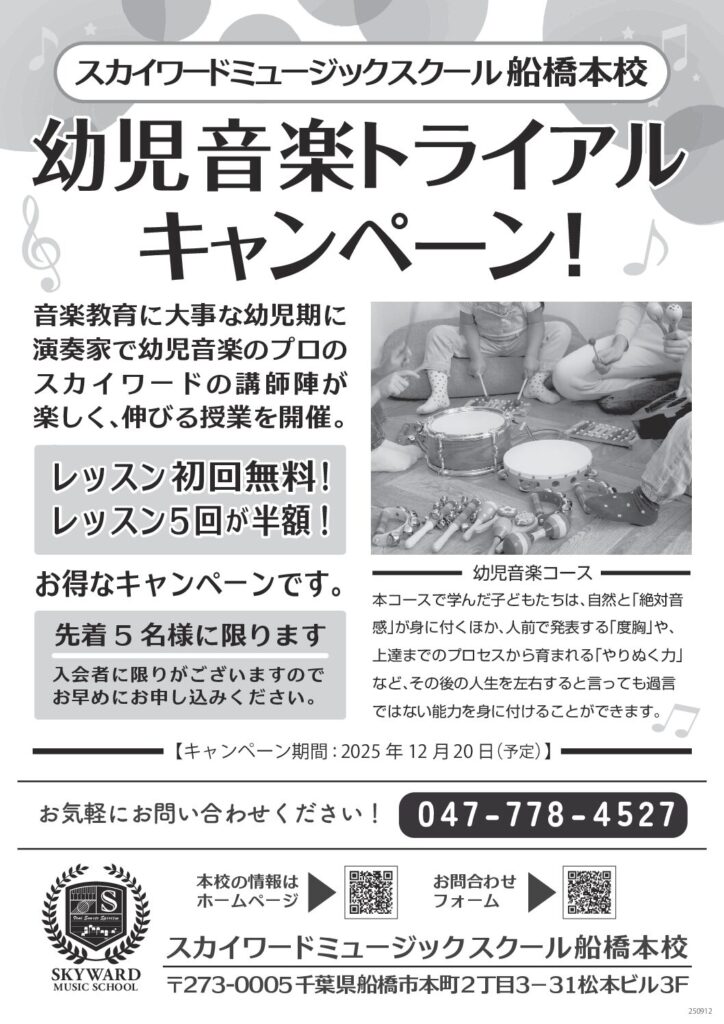 【🎵 幼児音楽トライアルキャンペーンのお知らせ 🎵】 スカイワードミュージックスクール船橋本校では、幼児音楽コースの特別キャンペーンを実施いたします。 音楽教育において最も大切な「幼児期」。当スクールでは、演奏家でもある講師陣...